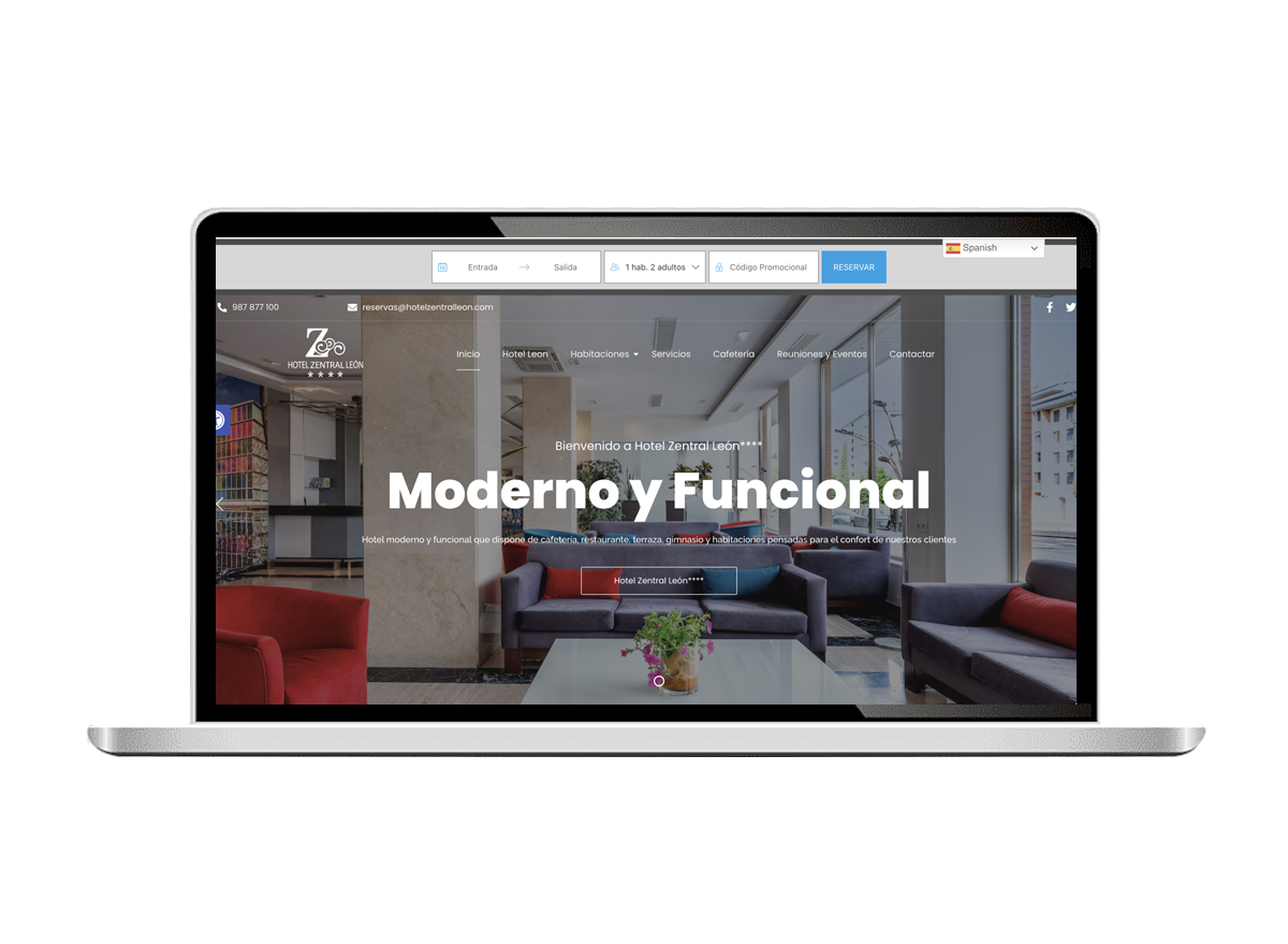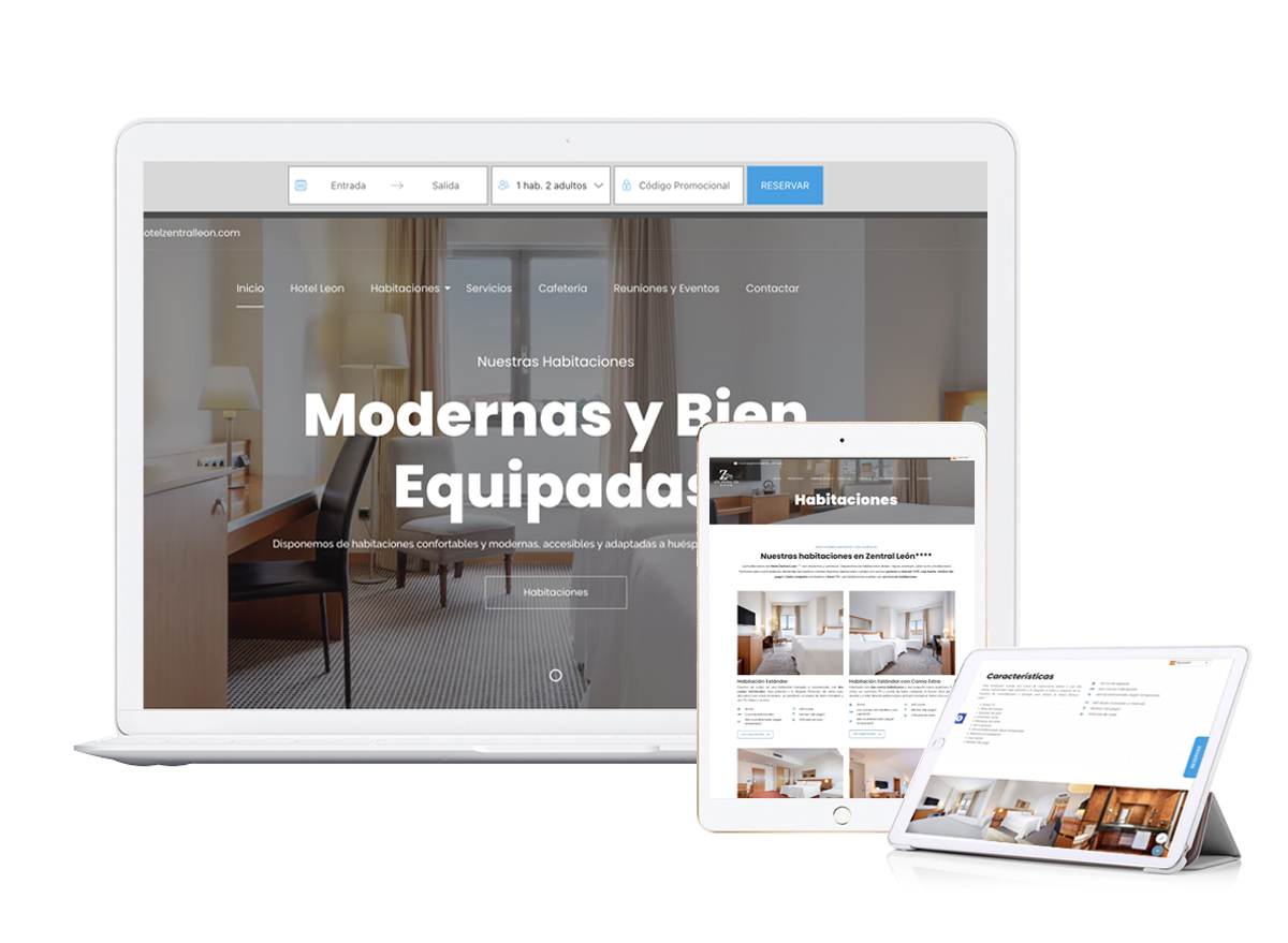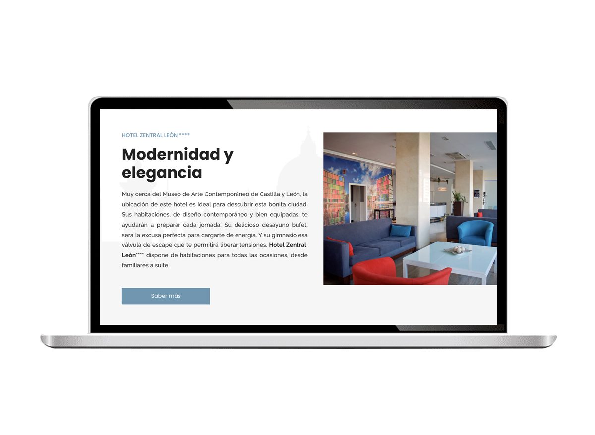 Hemos diseñado y desarrollado las webs de los hoteles que se integran dentro de la red Hoteles Zentral de Valladolid, Toledo, Zaragoza, Gijón, Madrid, Oviedo, León. Hoy presentamos el Hotel Zentral León****. Las web son modernas, con información sobre el hotel, motor de reservas, presentación de la carta del restaurante, galería de imágenes, servicios…