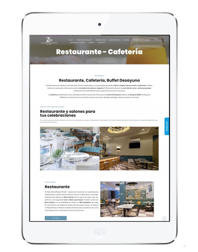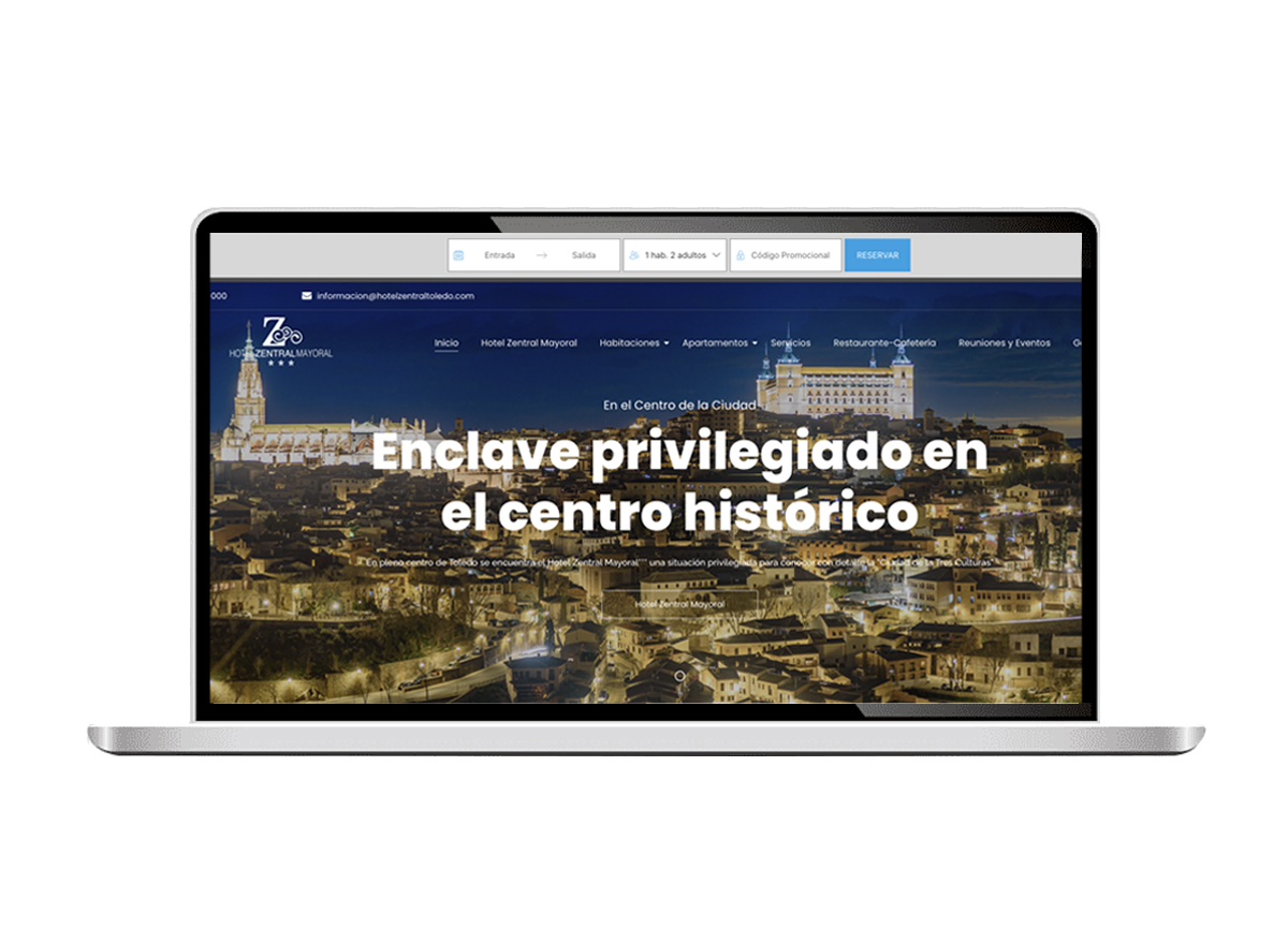 Hemos diseñado y desarrollado las webs de los hoteles que se integran dentro de la red Hoteles Zentral de Valladolid, Toledo, Zaragoza, Gijón, Madrid, Oviedo, León. Hoy presentamos el Hotel Zentral Parque de Valladolid. Las web son modernas, con información sobre el hotel, motor de reservas, presentación de la carta del restaurante, galería de imágenes, servicios…