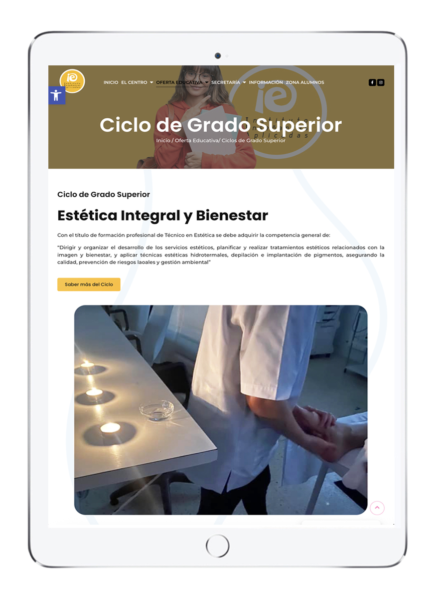 Portal Web del IEA Instituto de Enseñanzas Aplicadas. En la web se pueden consultar los cursos de FP de Grado Medio y Superior que se pueden cursar en él. Se ofrece información detallada de horarios, créditos, tipos de cursos, formación on line…