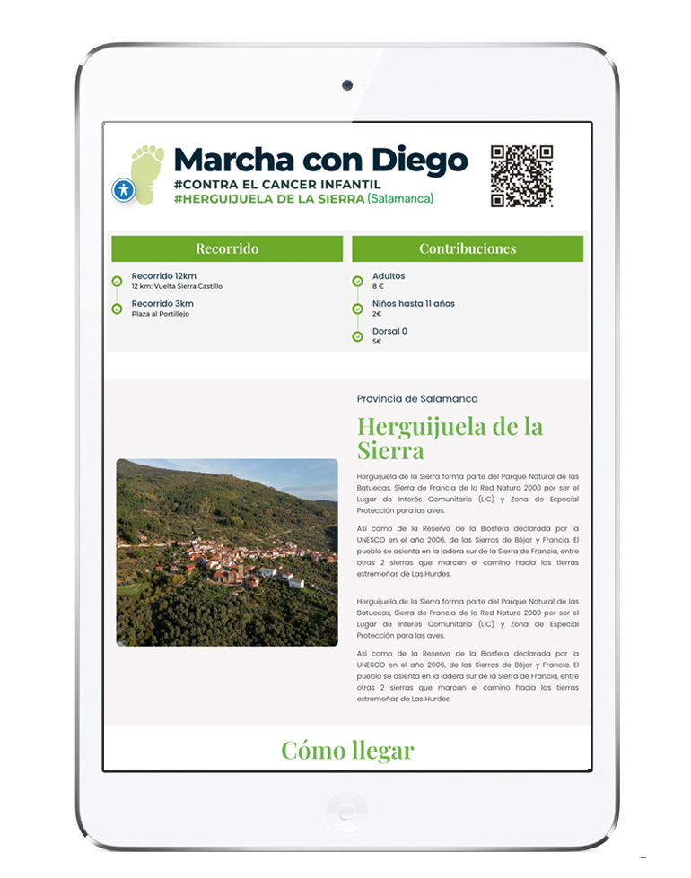 Se ha diseñado y desarrollado la web para el proyecto sin ánimo de lucro «Marcha con Diego». El objetivo es la celebración de una marcha en Herguijuela de la Sierra de 12Km en la que puede participar quien lo desee. Solo se pide la compra del dorsal y lo recaudado es destinado a lucha contra el cáncer infantil. Todo el mundo que participa lo hace aportando trabajo, servicios, especies o económico o realizando la marcha. Es necesario reseñar que toda participación sea del tipo que sea se realiza de forma desinteresada y con el único deseo de contribuir con tan esperanzador proyecto
