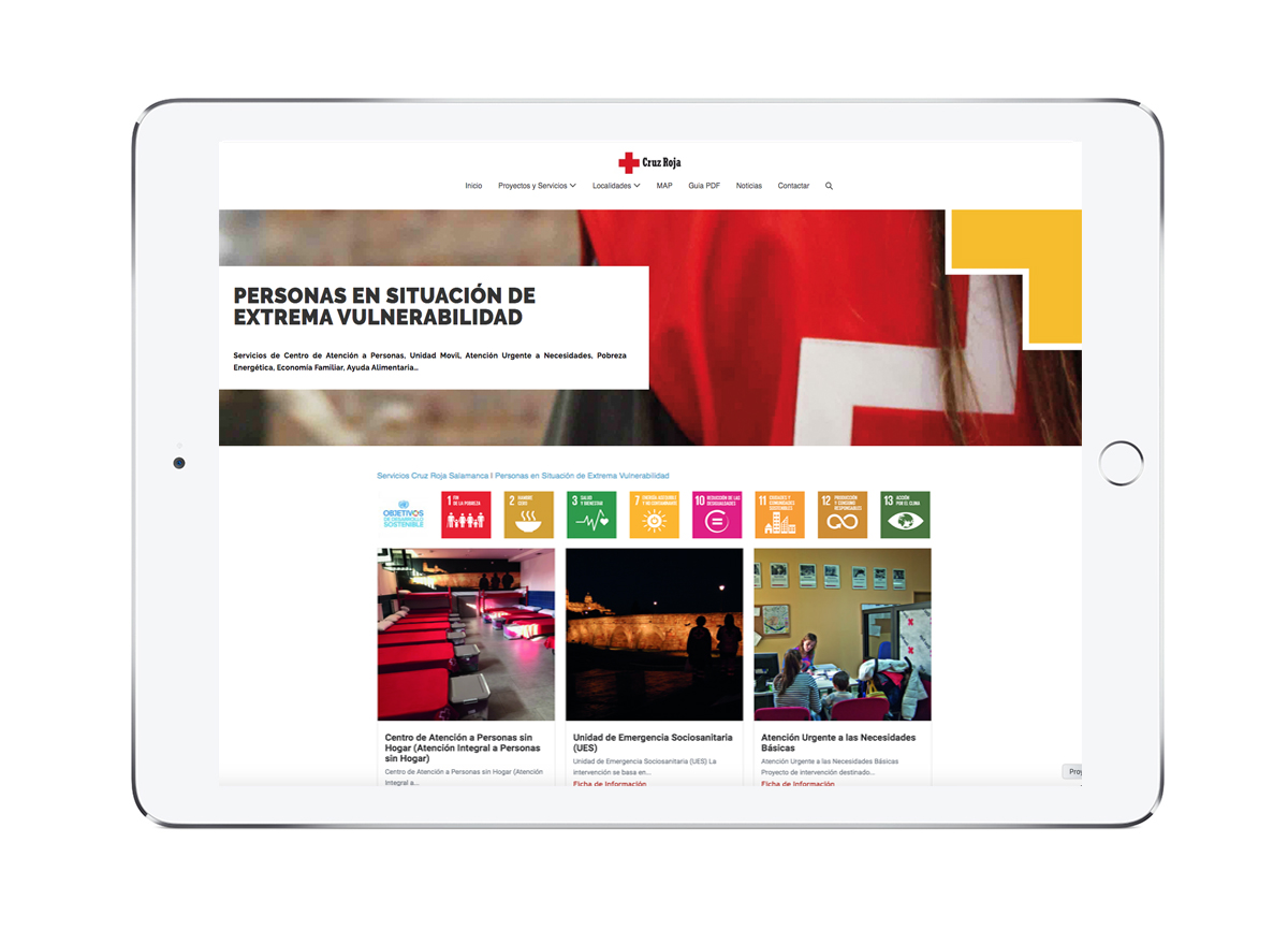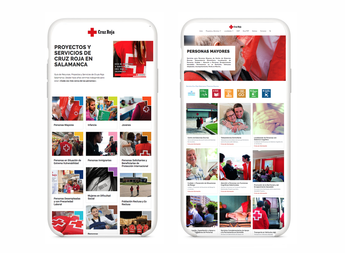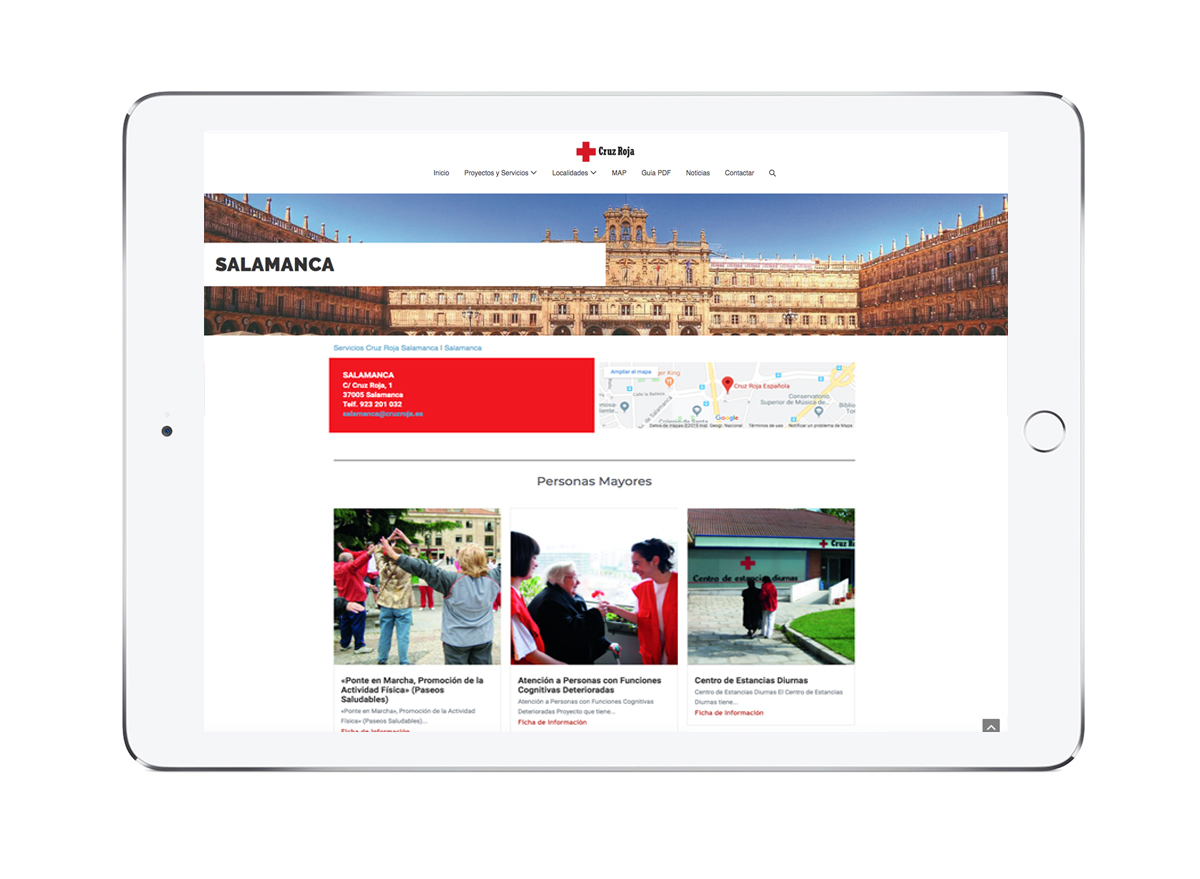 Diseño de web que recoge los servicios que ofrece Cruz Roja Española en Salamanca y en la provincia. Reúne cerca de cien proyectos que llevan a cabo desde Cruz Roja Salamanca como Atención a Personas Mayores, Juventud, Infancia, Personas en Situaciones de Extrema Vulnerabilidad, Inmigrantes, Personas Desempleadas, Mujer etc.. queda uno de los bloques se divide en sus propios proyectos que quedan recogidos en fichas de carácter informativo con los datos necesarios sobre cada uno de los servicios. También se recogen los servicios que se llevan a cabo en los municipios donde se encuentran delegaciones comarcales de Cruz Roja